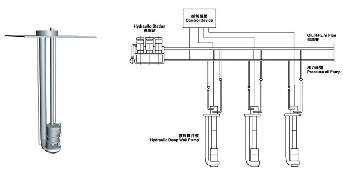 YQB型液壓深井貨泵系統(tǒng)由液壓站,深井貨泵及控制裝置三大部分組成,見系統(tǒng)示意圖。液壓站安裝在機艙內(nèi),由它向船上所有貨泵提供液壓能源,并有系統(tǒng)過載保護;深井貨泵安裝在甲板上,潛入到貨艙底部工作,它由液壓馬達驅(qū)動,一艙一泵;控制裝置安裝在主控室內(nèi),通過它控制深井貨泵的輸出流量,及監(jiān)測系統(tǒng)的運行狀態(tài)。泵的流量既可在主控室內(nèi)進行遙控,也可在甲板上進行現(xiàn)場手動控制。